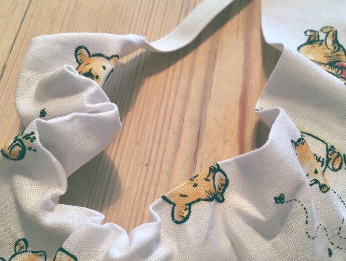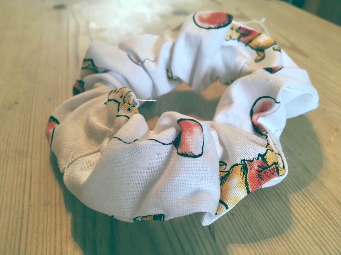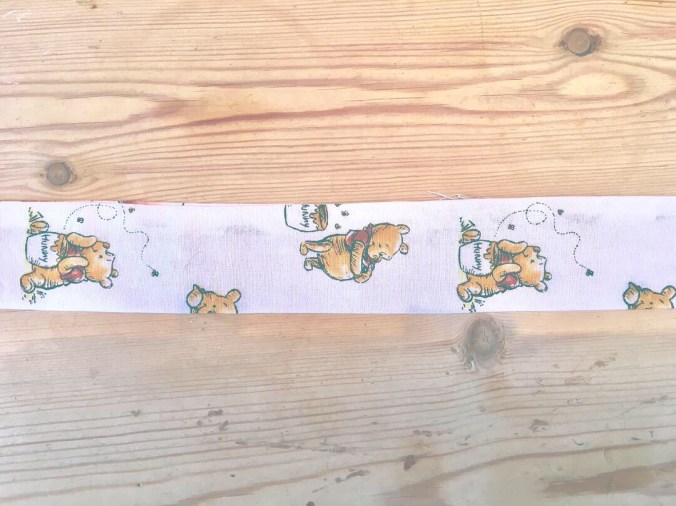 – fabric: you can use whatever material you have, but I coincidentally had some Winnie The Pooh fabric – left over from a previous sewing ‘project’. The size of the piece of fabric is also variable, depending on the size of your wrist. Measure the fabric around your wrist with a couple of inches spare. If it fits around your arm, it will fit around your hair at least twice.