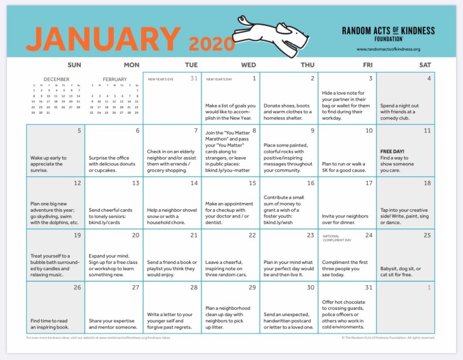 In this new year I would like to bring a focus. I see ‘words of the year’ all over social media and thought it would be a good idea to try it out for myself. The word for 2020 is Lykke, the Danish word for happiness. As one of my new years goals is to become a RAKtivist I thought it would be appropriate to use a word that would tie in with the idea of kindness. A RAKtivist is a person who commonly displays random acts of kindness. You can sign up on the Random Acts Of Kindness website and get a free calendar for each month. It is quite unrealistic for me to aim to do one random act of kindness a day but doing it sometimes is better than nothing.