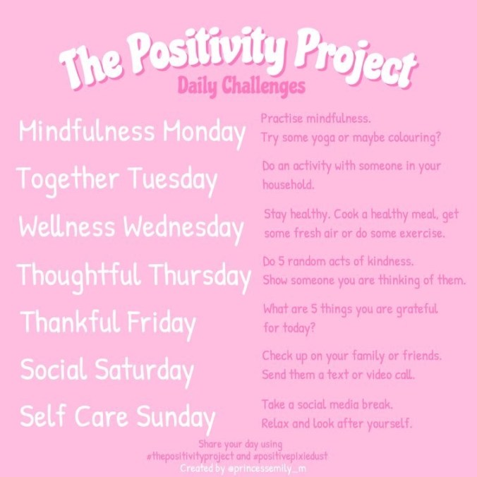 Throughout these difficult times, a group of my friends on Instagram decided to form The Positivity Project. Created by Emily, this project aims for people to be more happy even in the most difficult circumstances. To launch this project, I will be posting every single day this week: updating you on the recent prompts and how to complete them. Before we begin, I would like you to head on over to Emily’s blog (and Instagram) because she is the amazing person who create this idea. Without further ado… let’s get started!